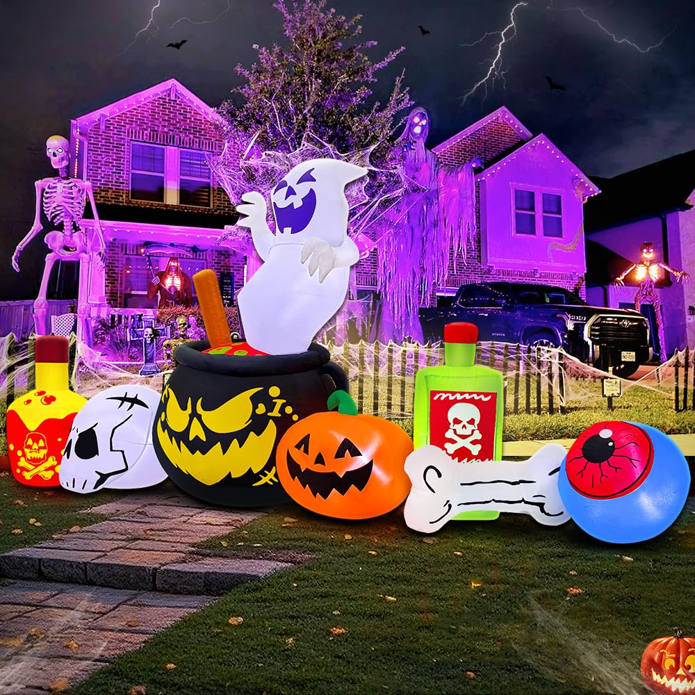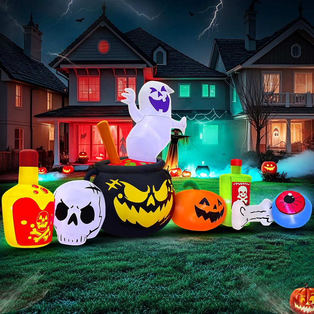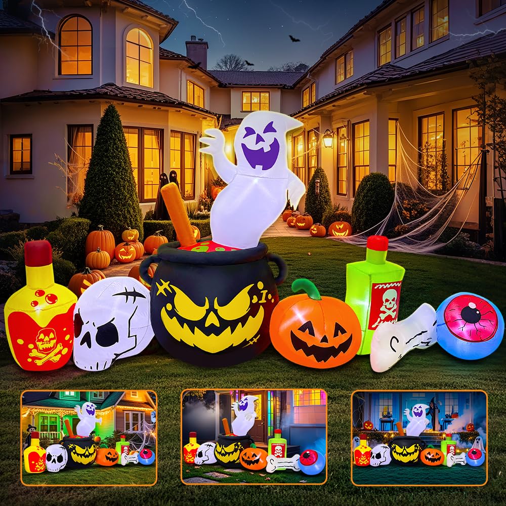- 【Halloween Decorations Outdoor】: These inflatable Halloween Decor are designed specifically for Halloween Holiday/parties/carnivals/festivals, so easy to add character to your outdoor Halloween decor. Perfect Halloween blowups for yard, front porch, patio, mall, party. Can't not wait to put Poison Boiled Ghost/skull/pumpkin Halloween inflatable out for Halloween. Your neighbors will love it! Trick or treat event decoration, festive night event. Enjoy and hi up!