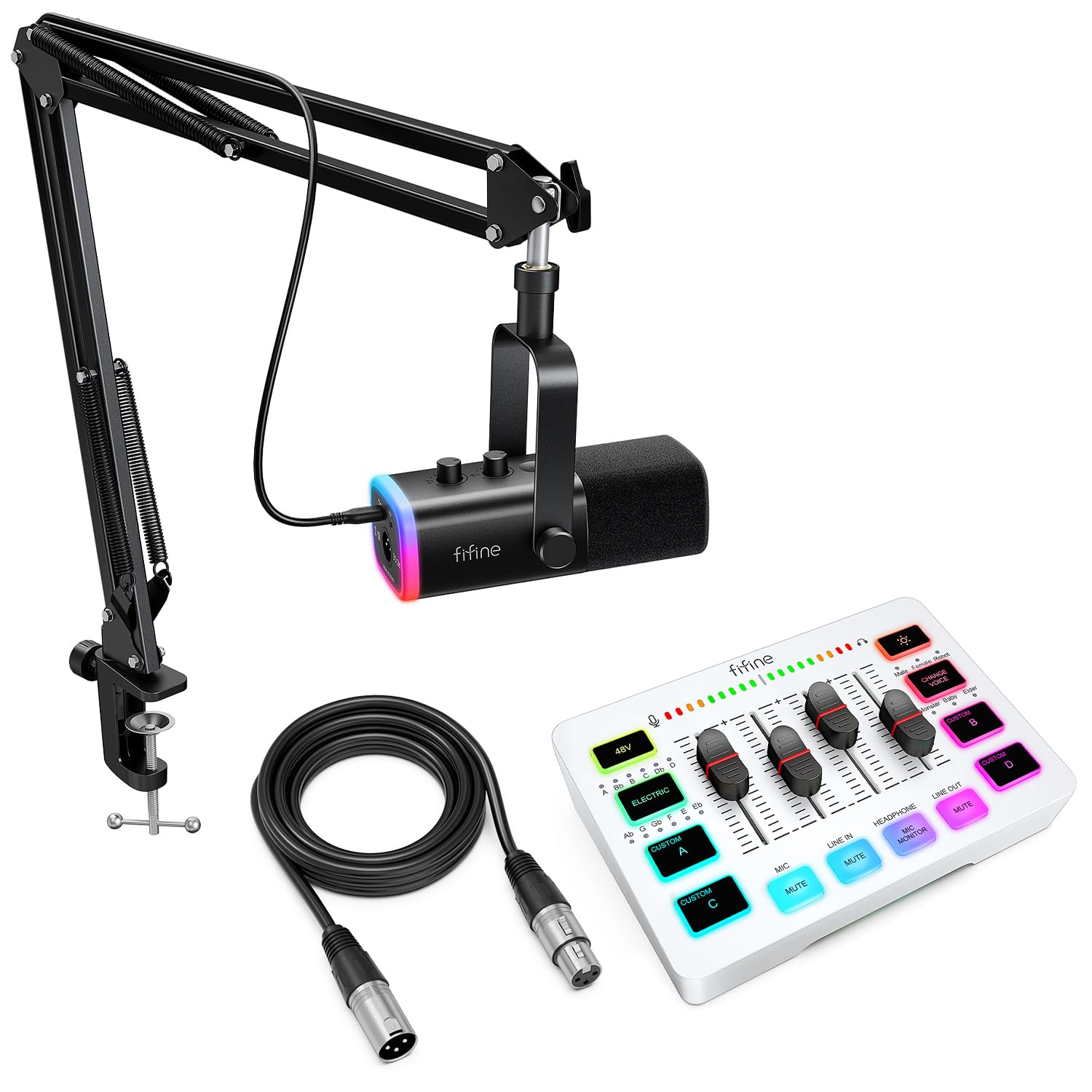 FIFINE Gaming Microphone Bundle with RGB Audio Mixer, XLR Cable, Podcast Equipment Set for Streaming, Vocal, Voice-Over, Compatible with PC with Mute, Gain Knob, Headphones Monitor (AM8T+SC3W+L9)