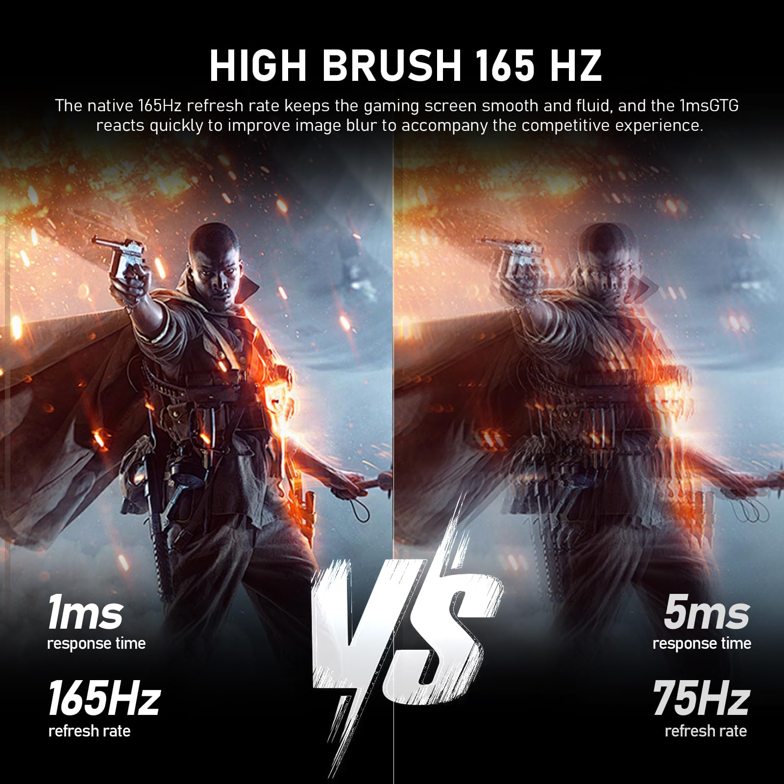 - 【165hz fast and smooth enough】 The confrontation of the game depends on the reaction speed of each operation, high refresh rate of 165hz (HDMI up to 120Hz, DP up to 165Hz), the image is smooth and delicate, eliminates the feeling of lag, combined with a gtg response speed of 1ms, eliminates the streaks generated by the high moving images, The game's image is fluid and without Kardon, the battlefield is under your control