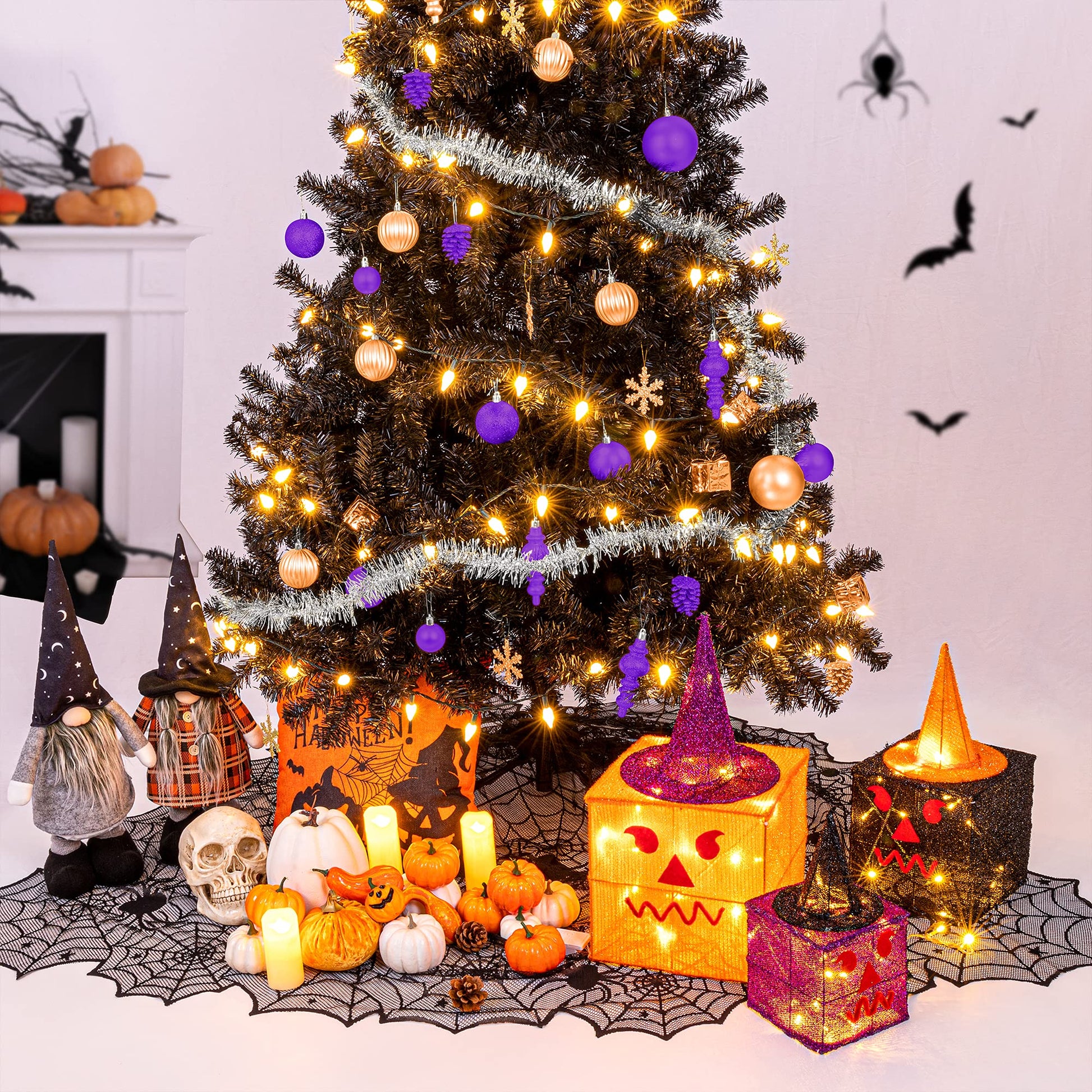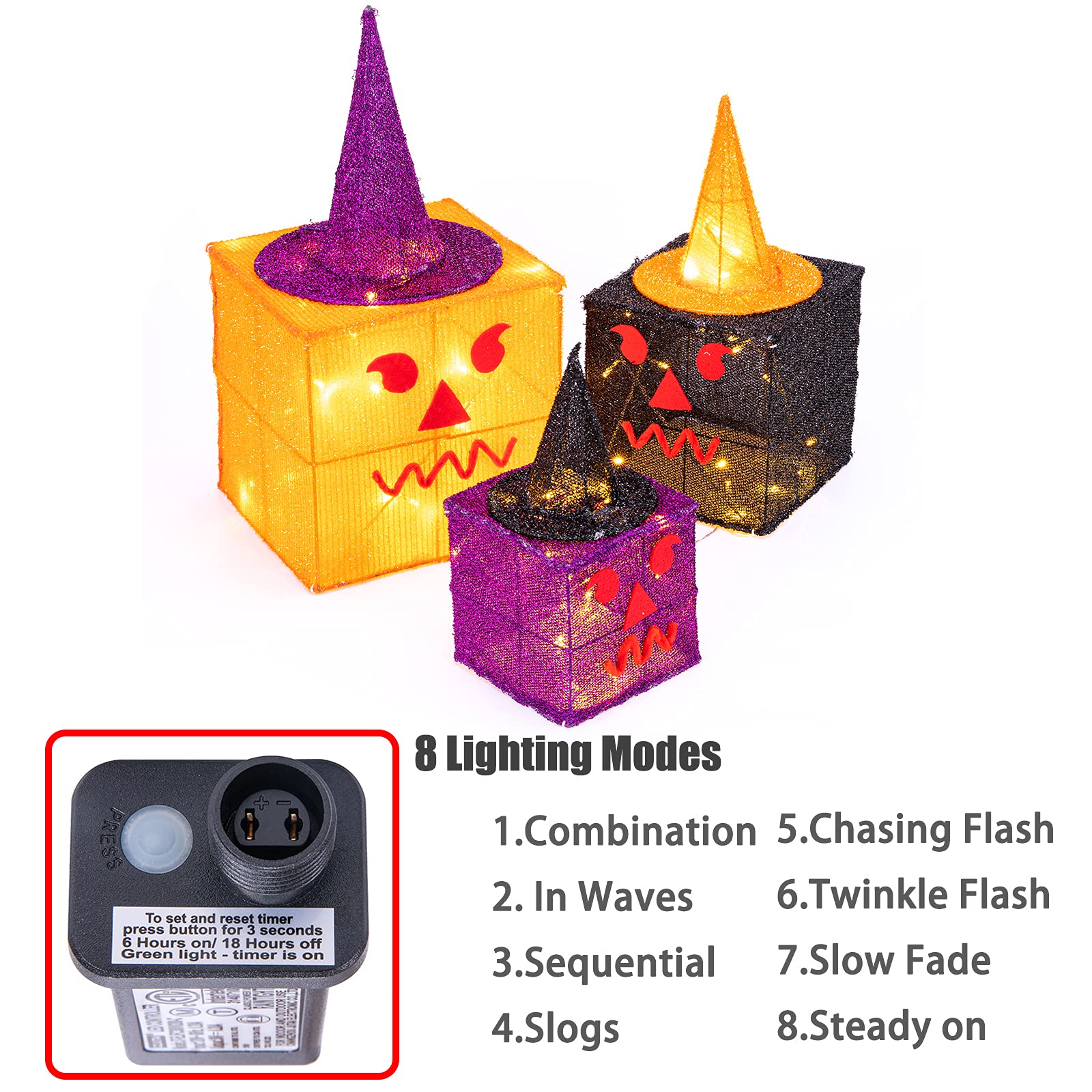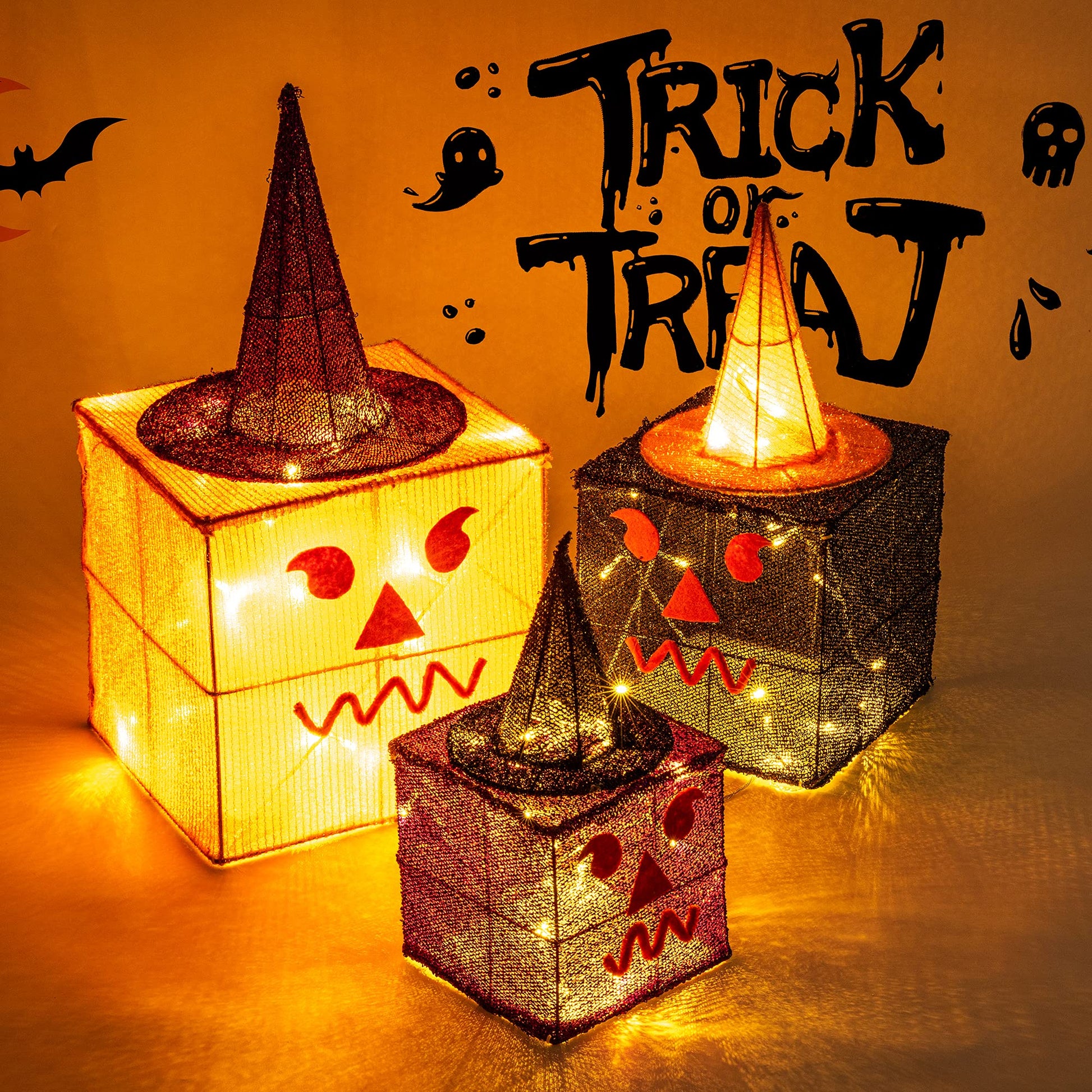Sunnyglade 3 Pack Halloween Decoration Gift Box with Plug, Top Hat and 70 LED Lights for Halloween, Autumn, Yard, House Party Supplies