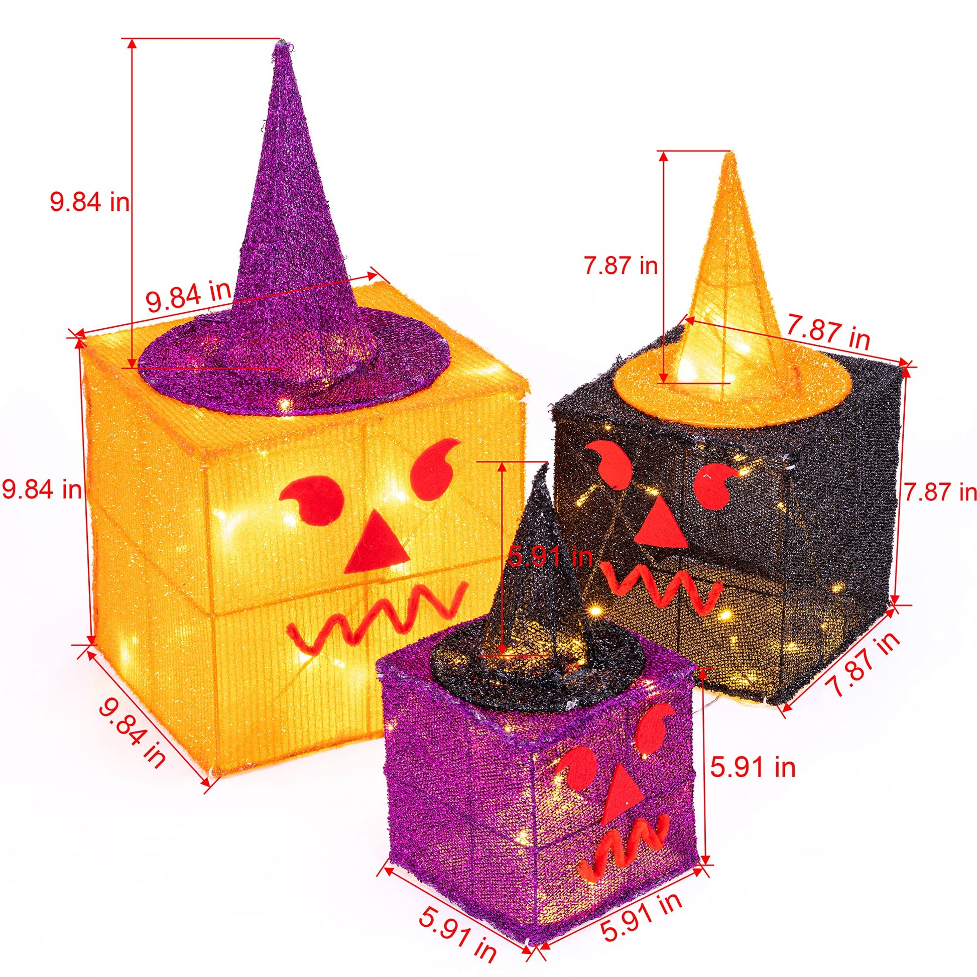 - Packaging Included: 3 pack Halloween top hat gift box decoration with 70 LED light.L:9.8x9.8x19.7 in, M:7.9x7.9x15.8 in,S:5.9x5.9x11.8 in.If you have any questions during the purchase process, please feel free to contact us and we will reply as soon as possible.