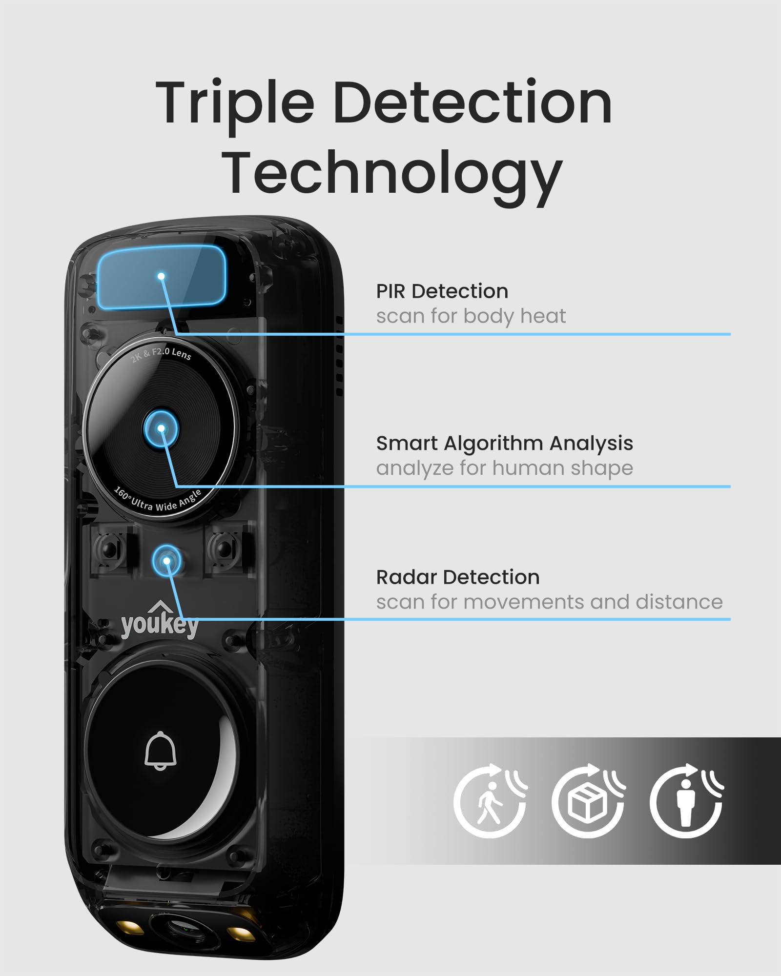 youkey Wireless Doorbell Camera with Chime, No Monthly Fee, 2K Video Doorbell with Dual Cam, AI + Radar + PIR Detection, 2.4/5GHz WiFi-6, Two-way Talk, Color Night Vision, Battery/Wired Powered, DB312